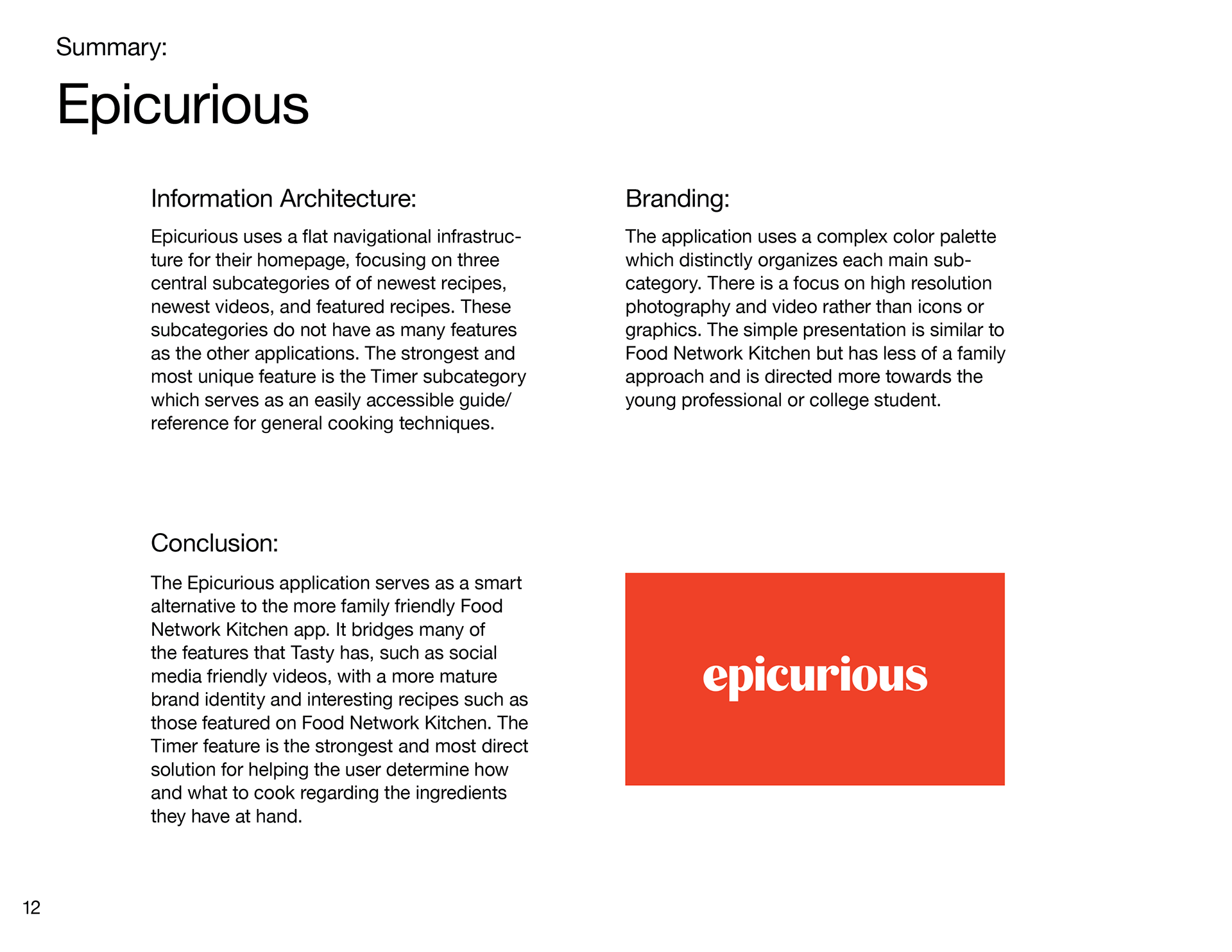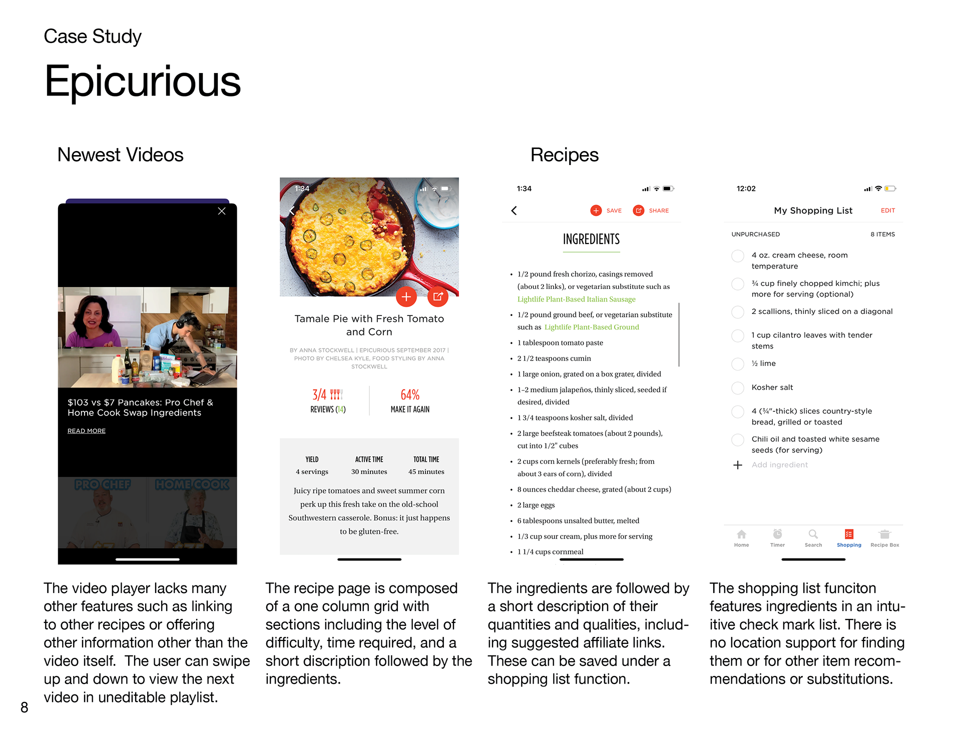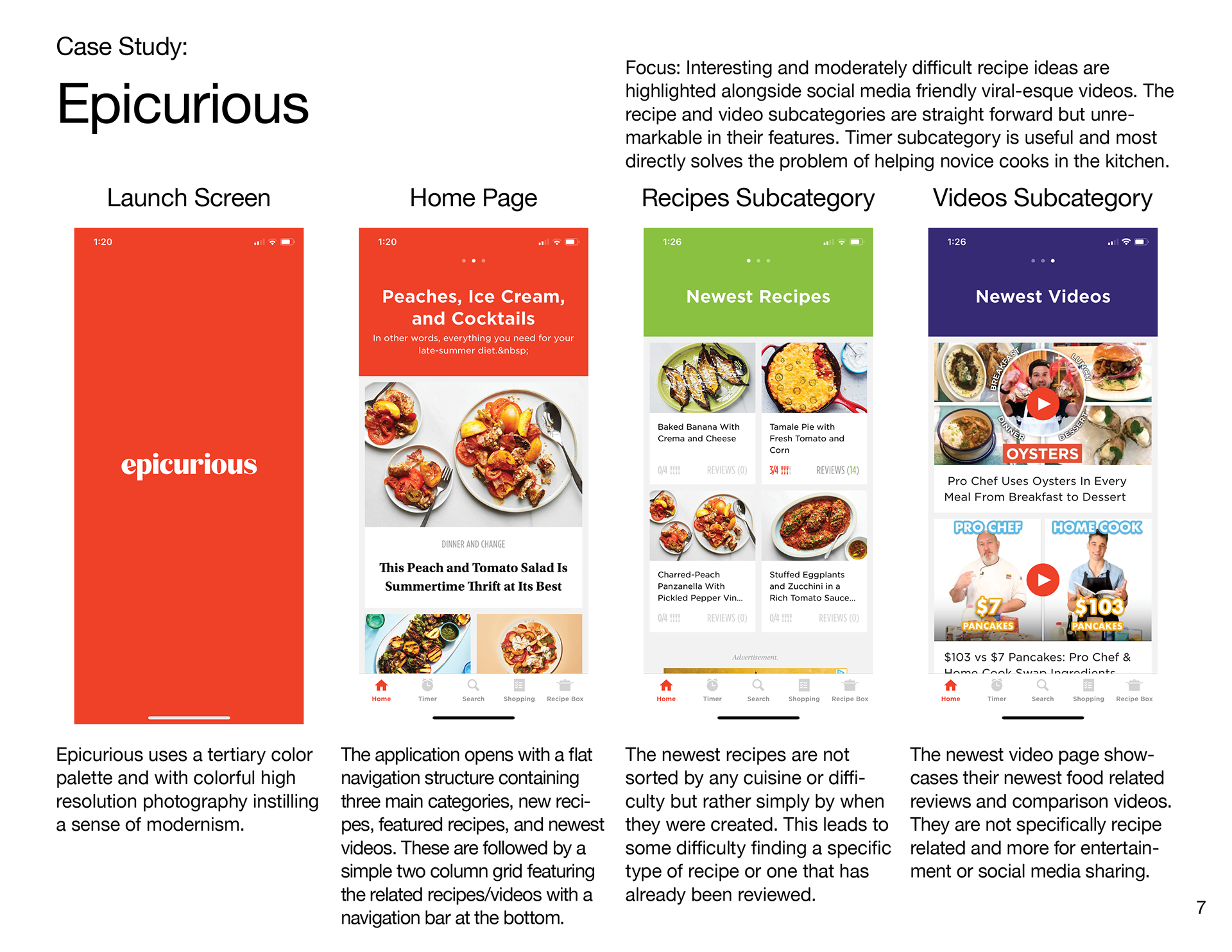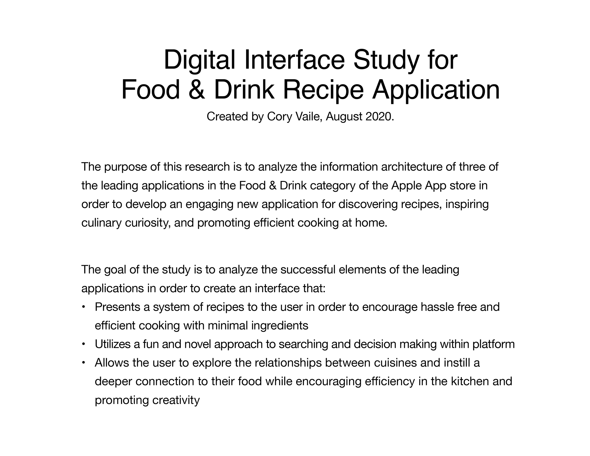 This is a research based design study I created to develop a Food & Drink application user interface. I created a case study comprising the three top competing applications from this category in the Apple app store and analyzed and critiqued their information architecture, branding identity, and the overall effectiveness of their features. From this I was able to gain insight into developing my own culinary application that I am developing as a personal project.
